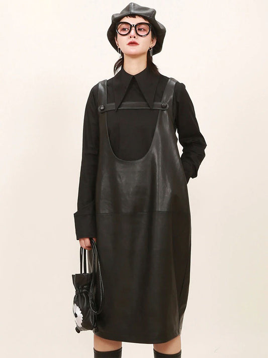 Casual Loose Solid Color U-Neck Splicing Bandage Faux Leather Straps Dress