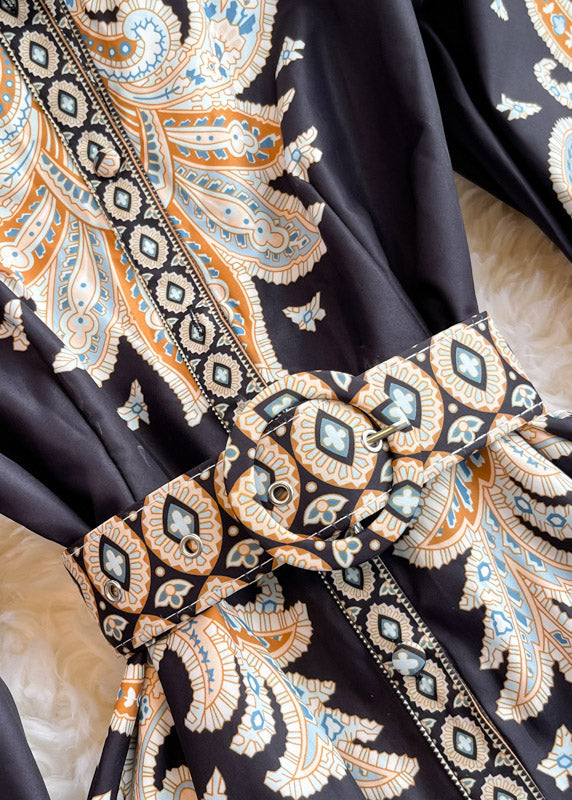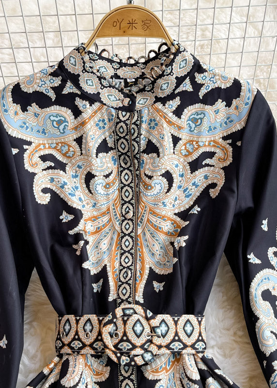 Black Stand Collar Sashes Button Long Dresses Puff Sleeve