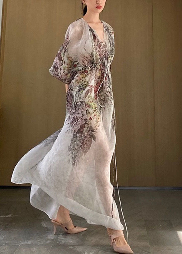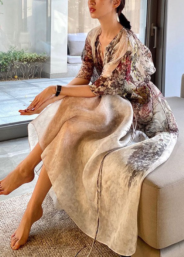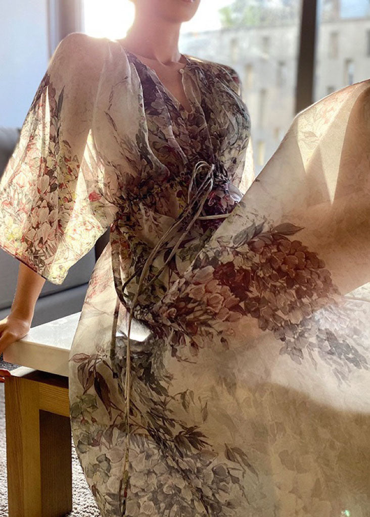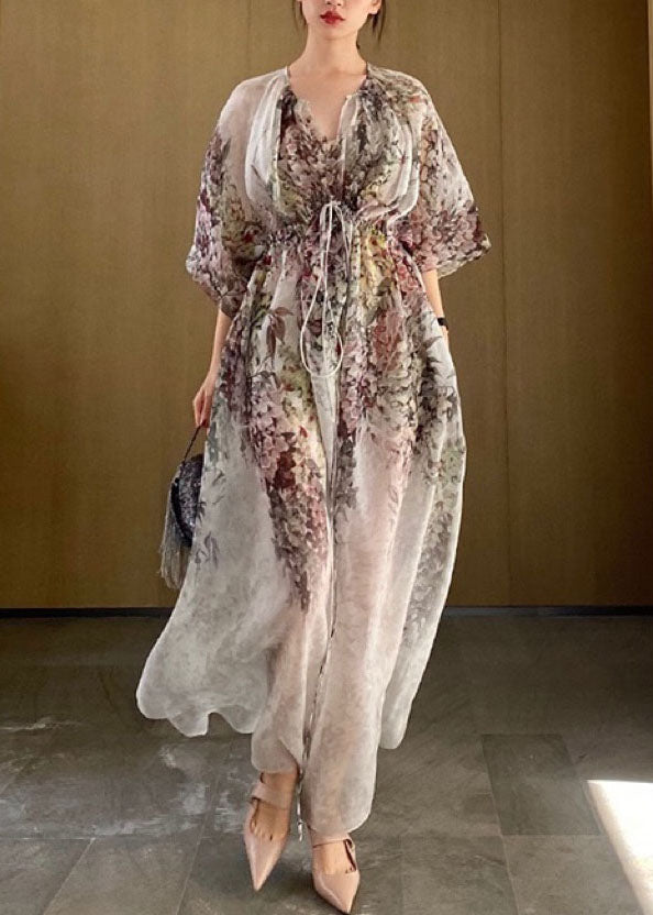 Bohemian V Neck Print Drawstring Chiffon Maxi Dresses Half Sleeve