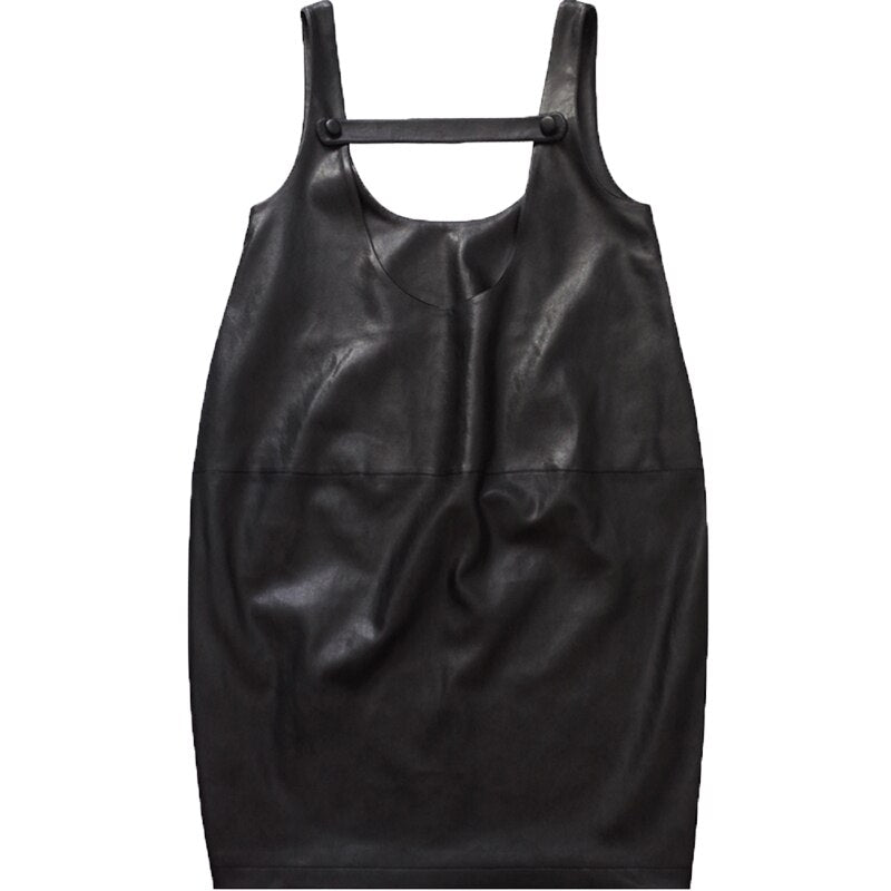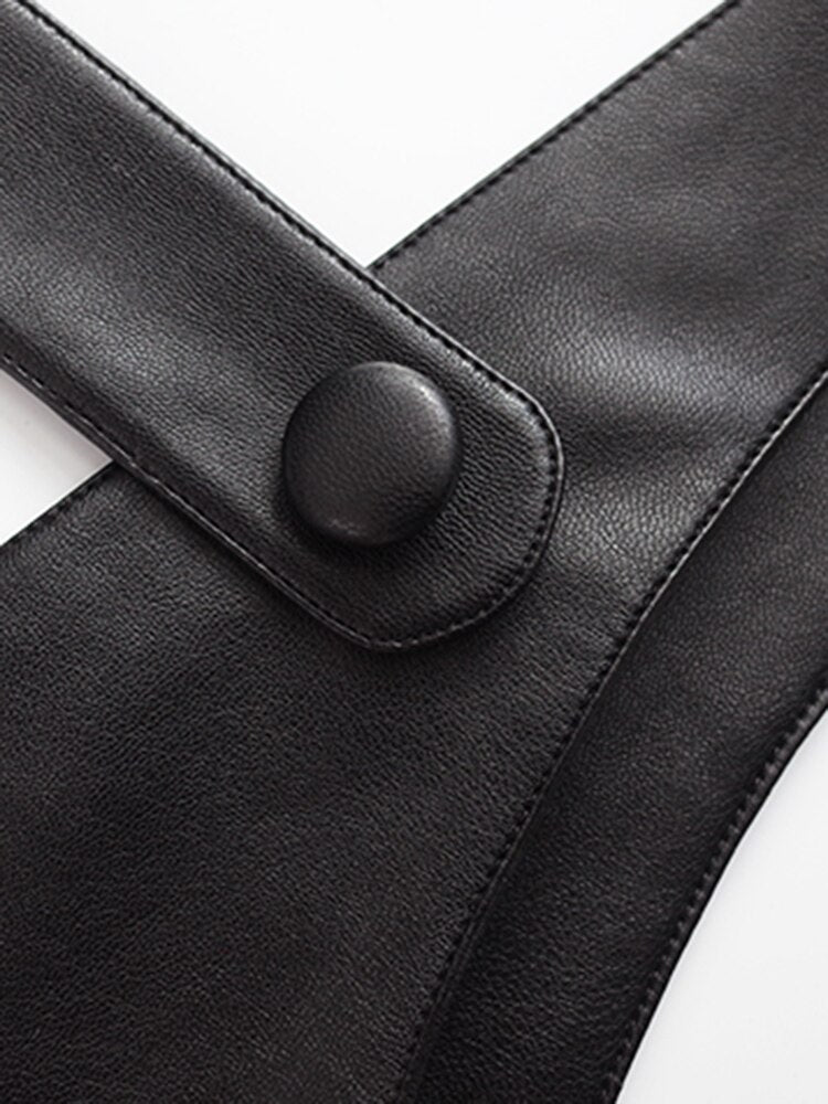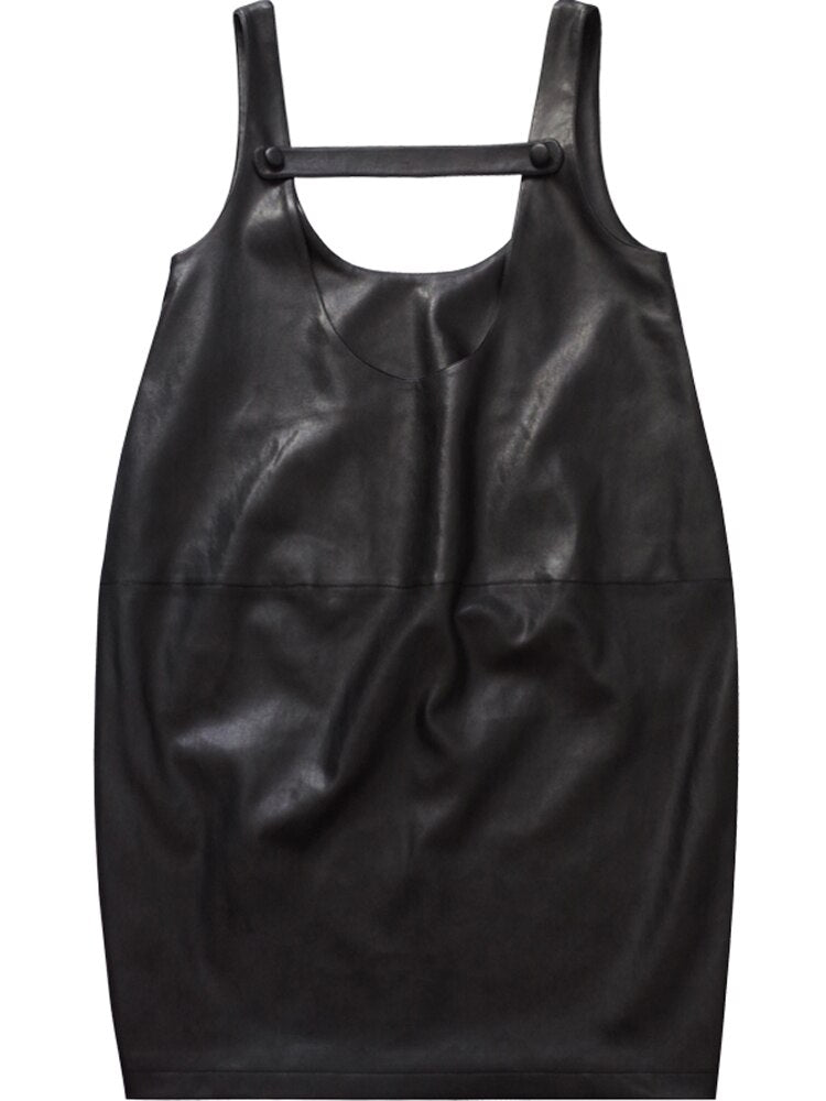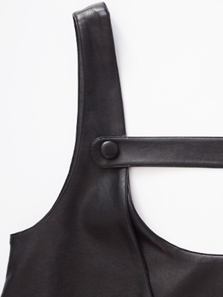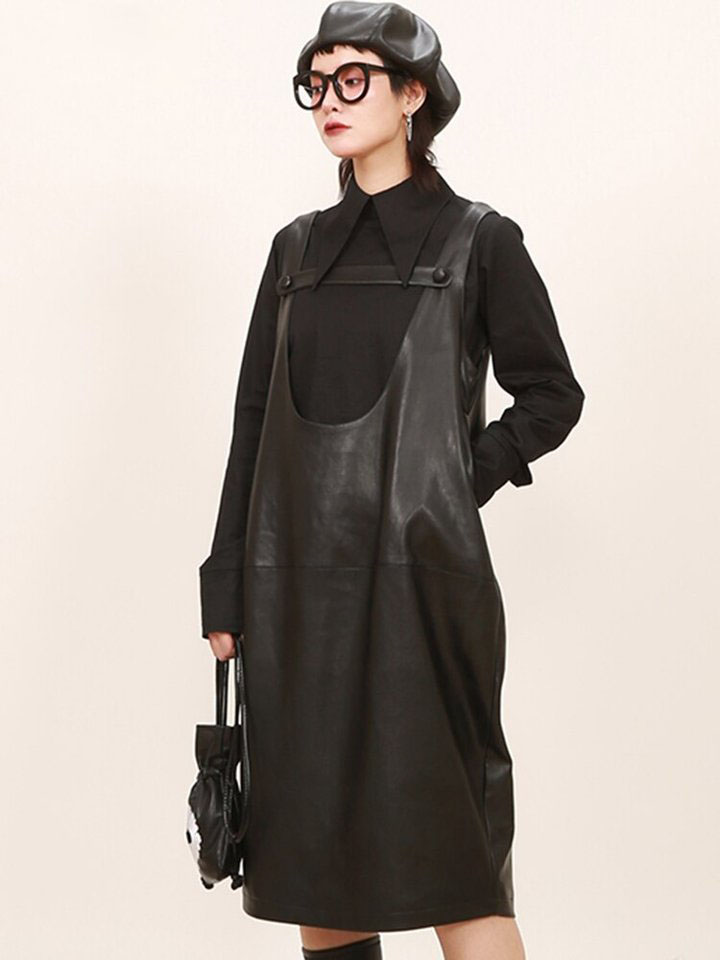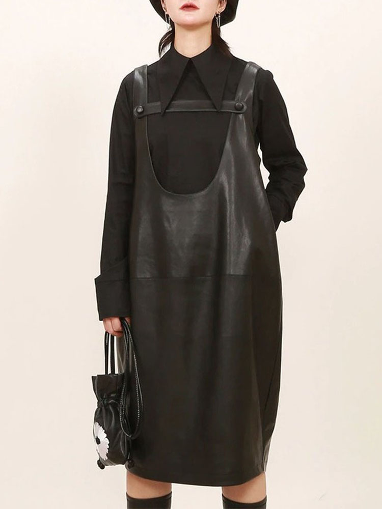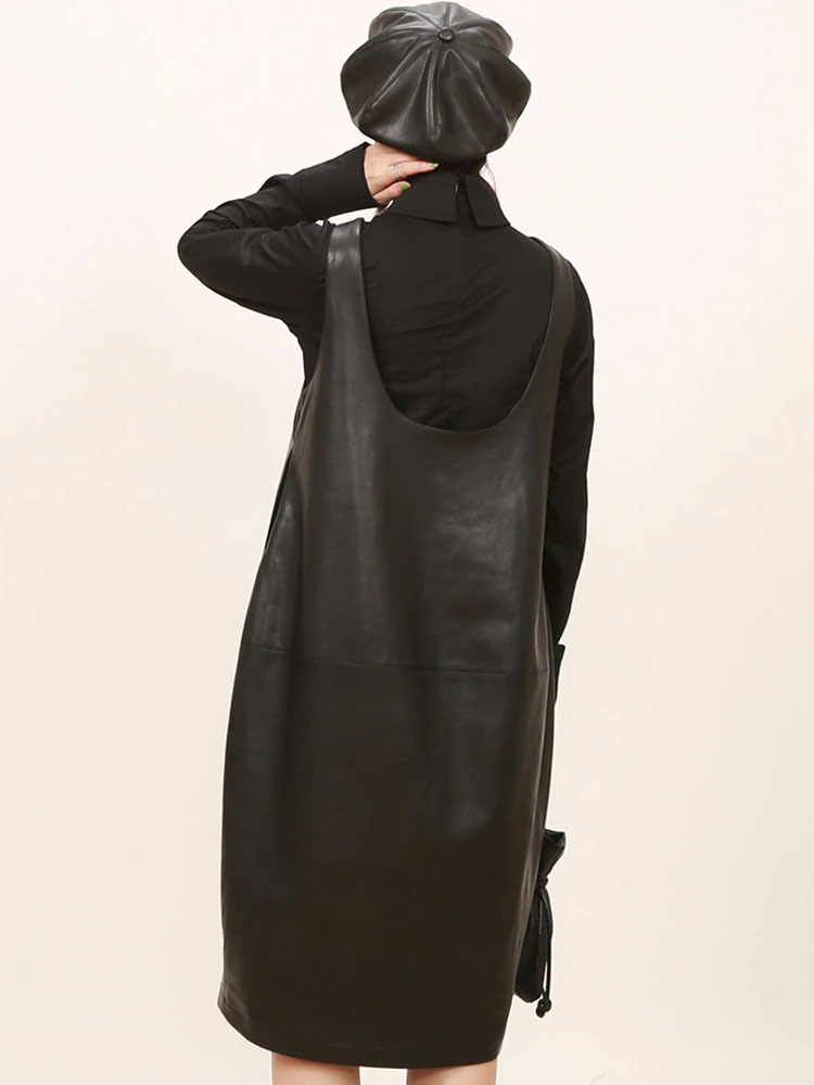 Casual Loose Solid Color U-Neck Splicing Bandage Faux Leather Straps Dress