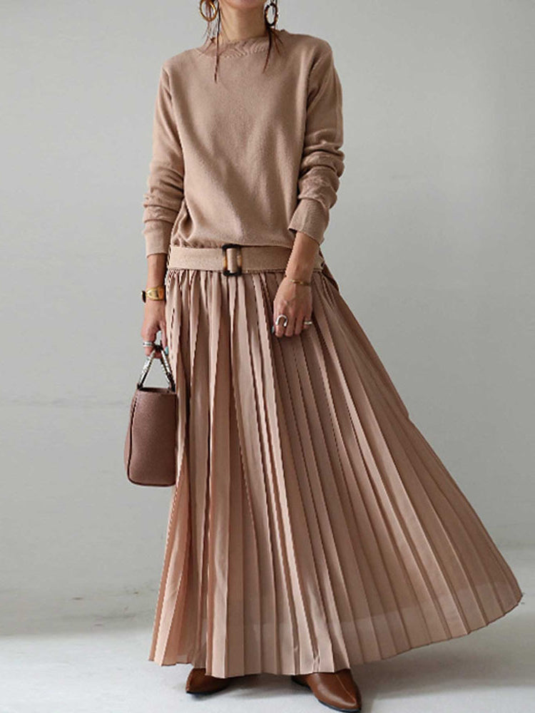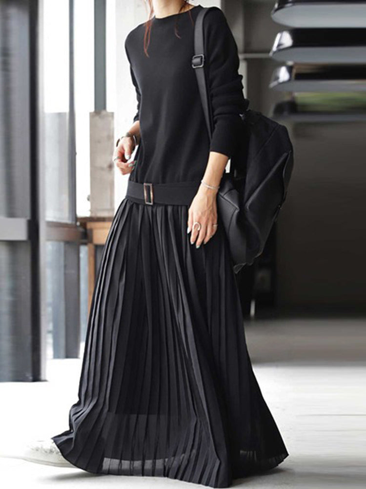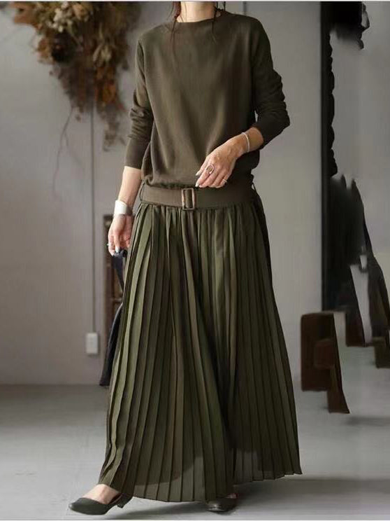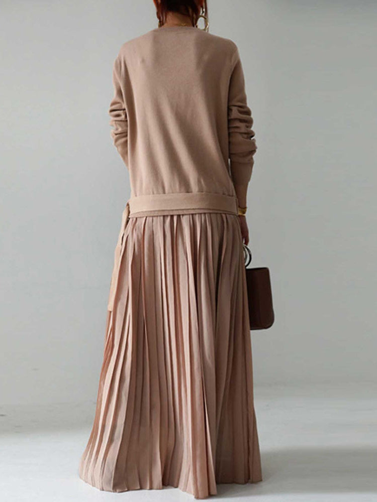 Elegant Round Neck Belt Solid Pullover Knit Panel Long Sleeve Pleated Dress