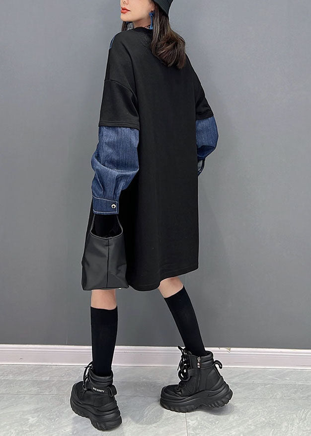 Plus Size Black O-Neck Denim Patchwork Cotton Robe Dresses Fall